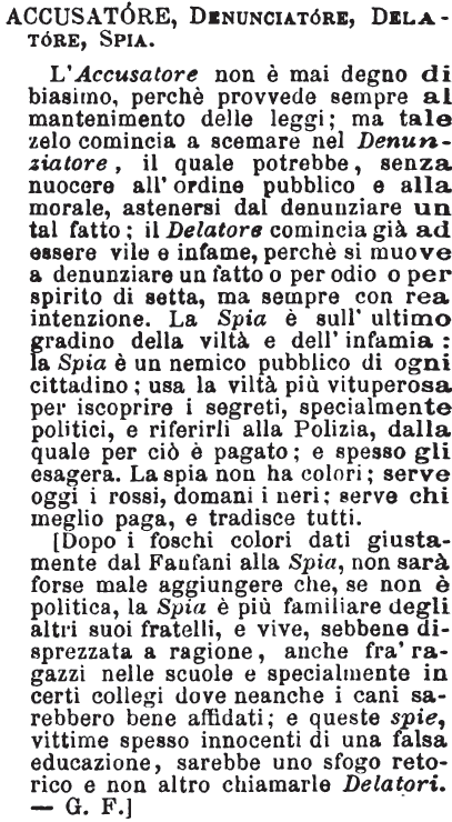 Accusatore, Denunciatore, Delatore, Spia - L'Accusatore non è mai degno di biasimo, perchè provvede sempre al mantenimento delle leggi; ma tale zelo comincia a scemare nel Denunziatore, il quale potrebbe, senza nuocere all'ordine pubblico e alla morale, astenersi dal denunziare un tal fatto; il Delatore comincia già ad essere vile e infame, perchè si muove a denunziare un fatto o per odio o per spirito di setta, ma sempre con rea intenzione. La Spia è sull'ultimo gradino della viltà e dell'infamia: la Spia è un nemico pubblico di ogni cittadino; usa la viltà più vituperosa per iscoprire i segreti, specialmente politici, e riferirli alla Polizia, dalla quale per ciò è pagato; e spesso gli esagera. La spia non ha colori; serve oggi i rossi, domani i neri; serve chi meglio paga, e tradisce tutti.
