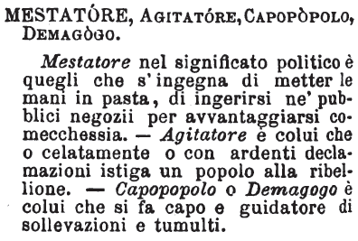 | Mestatore, Agitatore, Capopopolo, Demagogo - Mestatore nel significato politico è quegli che s'ingegna di metter le mani in pasta, di ingerirsi ne' pubblici negozii per avvantaggiarsi comecchessia. - Agitatore è colui che o celatamente o con ardenti declamazioni istiga un popolo alla ribellione. - Capopopolo o Demagogo è colui che si fa capo e guidatore di sollevazioni e tumulti. [immagine] |