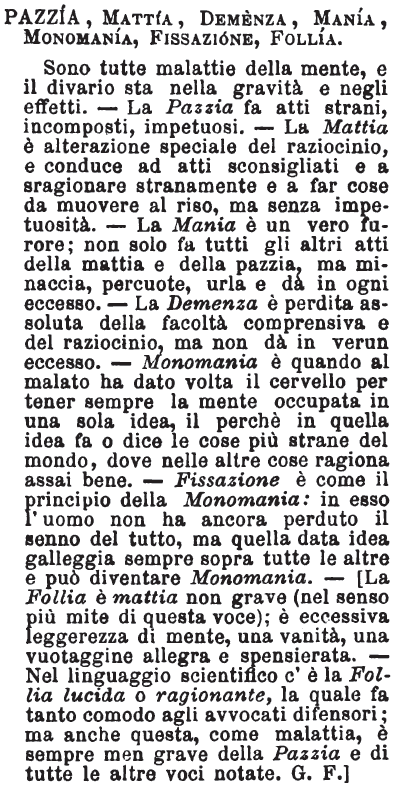 | Pazzia, Mattia, Demenza, Mania, Monomania, Fissazione, Follia - Sono tutte malattie della mente, e il divario sta nella gravità e negli effetti. - La Pazzia fa atti strani, incomposti, impetuosi. - La Mattia è alterazione speciale del raziocinio, e conduce ad atti sconsigliati e a sragionare stranamente e a far cose da muovere al riso, ma senza impetuosità. - La Mania è un vero furore; non solo fa tutti gli altri atti della mattia e della pazzia, ma minaccia, percuote, urla e dà in ogni eccesso. - La Demenza è perdita assoluta della facoltà comprensiva e del raziocinio, ma non dà in verun eccesso. - Monomania è quando al malato ha dato volta il cervello per tener sempre la mente occupata in una sola idea, il perchè in quella idea fa o dice le cose più strane del mondo, dove nelle altre cose ragiona assai bene. - Fissazione è come il principio della Monomania: in esso l'uomo non ha ancora perduto il senno del tutto, ma quella data idea galleggia sempre sopra tutte le altre e può diventare Monomania. - [La Follia è mattia non grave (nel senso più mite di questa voce); è eccessiva leggerezza di mente, una vanità, una vuotaggine allegra e spensierata. - Nel linguaggio scientifico c'è la Follia lucida o ragionante, la quale fa tanto comodo agli avvocati difensori; ma anche questa, come malattia, è sempre men grave della Pazzia e di tutte le altri voci notate. G. F.] [immagine] |