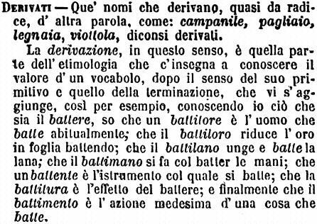 La derivazione, in questo senso, è quella parte dell'etimologia che c'insegna a conoscere il valore d'un vocabolo, dopo il senso del suo primitivo e quello della terminazione, che vi s'aggiunge, così per esempio, conoscendo io ciò che sia il battere, so che il battitore è l'uomo che batte abitualmente; che il battiloro riduce l'oro in foglia battendo; che il battilano unge e batte la lana; che il battimano si fa col batter le mani; che un battente è l'istrumento col quale si batte; che la battitura è l'effetto del battere; e finalmente che il battimento è l'azione medesima d'una cosa che batte. [immagine] |