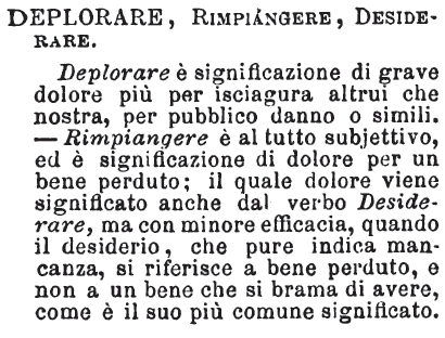 | Deplorare, Rimpiangere, Desiderare - Deplorare è significazione di grave dolore più per isciagura altrui che nostra, per pubblico danno o simili. - Rimpiangere è al tutto subjettivo, ed è significazione di dolore per un bene perduto; il quale dolore viene significato anche dal verbo Desiderare, ma con minore efficacia, quando il desiderio, che pure indica mancanza, si riferisce a bene perduto, e non a un bene che si brama di avere, come è il suo più comune significato. [immagine] |