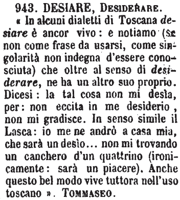 | Desiare, Desiderare - «In alcuni dialetti di Toscana desiare è ancor vivo: e notiamo (se non come frase da usarsi, come singolarità non indegna d'essere conosciuta) che oltre al senso di desiderare, ne ha un altro suo proprio. Dicesi: la tal cosa non mi desìa, per: non eccita in me desiderio, non mi gradisce. In senso simile il Lasca: io me ne andrò a casa mia, che sarà un desìo...non mi trovando un canchero d'un quattrino (ironicamente: sarà un piacere). Anche questo bel modo vive tuttora nell'uso toscano». Tommaseo. [immagine] |