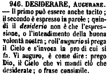 | Desiderare, Augurare - Il primo può essere anche tacito; il secondo è espresso in parole; quindi il desiderio non è che l'espressione, o l'intendimento della buona volontà nostra; coll'augurio si prega il Cielo e s'invoca in pro di cui si fa. Vi auguro, è come dire: prego Dio, il Cielo che vi mandi ciò che desiderate; o frase consimile. [immagine] |