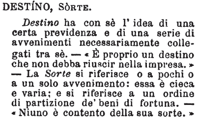 | Destino, Sorte - Destino ha con sè l'idea di una certa previsenza e di una serie di avvenimenti necessariamente collegati tra sè. - « È proprio un destino che non debba riuscir nella impresa.» - La Sorte si riferisce o a pochi o a un solo avvenimento: essa è cieca e varia; e si riferisce a un ordine di partizione de' beni di fortuna. - «Niuno è contento della sua sorte.» [immagine] |