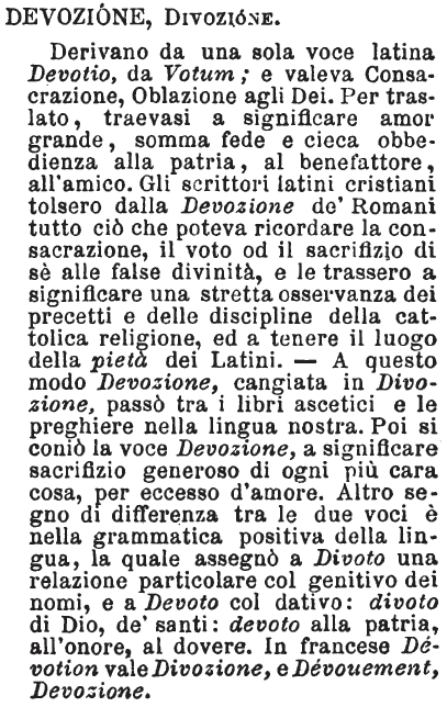 | Devozione, Divozione - Derivano da una sola voce latina Devotio, da Votum; e valeva Consacrazione, Oblazione agli Dei. Per traslato, traevasi a significare amor grande, somma fede e cieca obbedienza alla patria, al benefattore, all'amico. Gli scrittori latini cristiani tolsero dalla Devozione de' Romani tutto ciò che poteva ricordare la consacrazione, il voto od il sacrifizio di sè alle false divinità, e le trassero a significare una stretta osservanza dei precetti e delle discipline della cattolica religione, ed a tenere il luogo della pietà dei Latini.- A questo modo Devozione, cangiata in Divozione, passò tra i libri ascetici e le preghiere nella lingua nostra. Poi si coniò la voce Devozione, a significare sacrifizio generoso di ogni più cara cosa, per eccesso d'amore. Altro segno di differenza tra le due voci è nella grammatica positiva della lingua, la quale assegnò a Divoto una relazione particolare col genitivo dei nomi, e a Devoto col dativo: divoto di Dio, de' santi: devoto alla patria, all'onore, al dovere. In francese Dévotion vale Divozione, e Dévouement, Devozione. [immagine] |