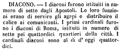 | Diacono - I diaconi furono istituiti in numero di sette dagli Apostoli. Le loro funzioni erano di servire gli agapi e di distribuire il calice ai comunicanti. I primi cardinali furono i diaconi di Roma, istituiti in numero di sette pei quattordici quartieri della città. I cardinali diaconi sono al di d'oggi quattordici. [immagine] |