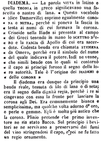| Diadema - La parola vitta in latino e quella teonia in greco significavano una fascetta o nastro di lana. «Questo vocabolo (dice Damarville) esprime egualmente corona e mitra, perchè si poneva la fascia in testa ai numi di cui formava la corona. Criseide nella Iliade si presenta al campo dei Greci tenendo in mano lo scettro d’oro e la fascia di Apollo di cui era sacerdote. Codesta benda era chiamata stemena da Omero, perchè era il simbolo del nume del quale indicava il potere. Indi ne venne, che simili bende con le quali si contornò il capo ai principi furono il segno della loro autorità. Tale è l’origine dei diademi e delle corone»