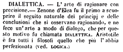 T. Non solo ragionando con altri, ma seco stesso, può la dialettica adoperarsi, secondo l'orig. Λέγω, Λόγος. Ma non conviene confondere la dialettica ch'è il modo, colla scienza ch'è la materia e il soggetto, e molto meno colla sapienza ch'è la guida e l'ispirazione del ragionare. Il Gioberti confondendo, dá all'ingegno italiano lode di dialettico; lode misera, che ritrae il lodatore. = D. Conv. 32. (C) La dialettica è minore in suo corpo, che niuna altra scienza. T. Per estens. Anco nel com. discorso non scientif. può usarsi dialettica. |