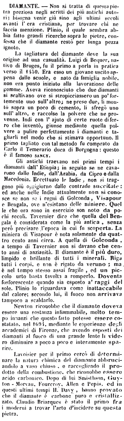 | Diamante - Non si tratta di questa pietra preziosa negli scritti dei più antichi autori; bisogna venir giù sino agli ultimi secoli avanti l'era cristiana, per trovare chi ne faccia menzione. Plinio, il quale sembra abbia fatto grandi ricerche sopra le pietre, confessa che il diamante restò per lunga pezza ignoto.