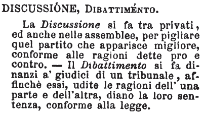 | Discussione, Dibattimento - La Discussione si fa tra privati, ed anche nelle assemblee, per pigliare quel partito che apparisce migliore, conforme alle ragioni dette pro e contro. - Il Dibattimento si fa dinnanzi a' giudici di un tribunale, affinchè essi, udite le ragioni dell'una parte e dell'altra, diano la loro sentenza, conforme alla legge. [immagine] |