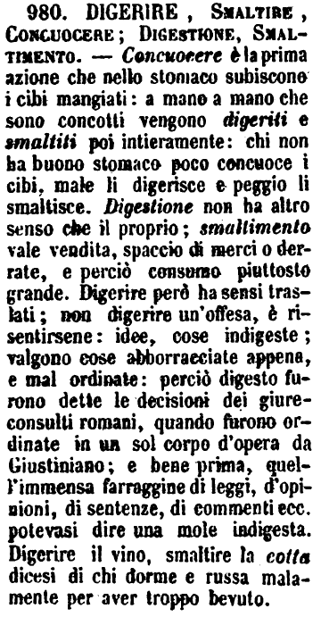 | Digerire, Smaltire, Concuocere; Digestione, Smaltimento - Concuocere è la prima azione che nello stomaco subiscono i cibi mangiati: a mano a mano che sono concotti vengono digeriti e smaltiti poi intieramente: chi non ha buono stomaco poco concuoce i cibi, male li digerisce e peggio li smaltisce. Digestione non ha altro senso che il proprio; smaltimento vale vendita, spaccio di merci o derrate, e perciò consumo piuttosto grande. Digerire però ha sensi traslati; non digerire un'offesa, è risentirsene: idee, cose indigeste; valgono cose abborracciate appena, e mal ordinate: perciò digesto furono dette le decisioni dei giureconsulti romani, quando furono ordinate in un sol corpo d'opera da Giustiniano; e bene prima, quell'immensa farraggine di leggi, d'opinioni, di sentenze, di commenti ecc. potevasi dire una mole indigesta. Digerire il vino, smaltire la cotta dicesi di chi dorme e russa malamente per aver troppo bevuto. [immagine] |