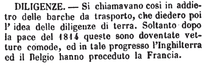 | Diligenze - Si chiamavano così in addietro delle barche da trasporto, che diedero poi l'idea delle diligenze di terra. Soltanto dopo la pace del 1814 queste sono doventate vetture comode, ed in tale progresso l'Inghilterra ed il Belgio hanno preceduto la Francia. [immagine] |