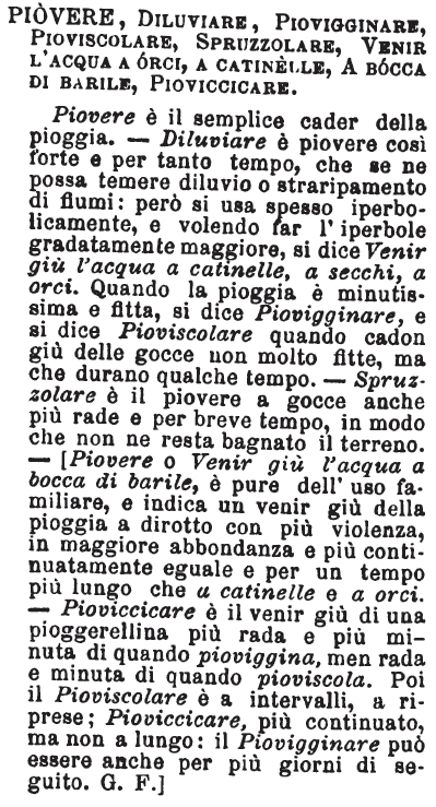 | Piovere, Diluviare, Piovigginare, Pioviscolare, Spruzzolare, Venir l’acqua a orci, A catinelle, A bocca di barile, Pioviccicare - Piovere è il semplice cader della pioggia. - Diluviare è piovere così forte e per tanto tempo, che se ne possa temere diluvio o straripamento di fiumi: però si usa spesso iperbolicamente, e volendo far l’iperbole gradatamente maggiore, si dice Venir giù l’acqua a catinelle, a secchi, a orci. Quando la pioggia è minutissima e fitta, si dice Piovigginare, e si dice Pioviscolare quando cadon giù delle gocce non molto fitte, ma che durano qualche tempo. - Spruzzolare è il piovere a gocce anche più rade e per breve tempo, in modo che non ne resta bagnato il terreno. – [Piovere o Venir giù l’acqua a bocca di barile, è pure dell’uso familiare, e indica un venir giù della pioggia a dirotto con più violenza, in maggior abbondanza e più continuatamente eguale e per un tempo più lungo che a catinelle e a orci. - Pioviccicare è il venir giù di una pioggerellina più rada e più minuta di quando pioviggina, men rada e minuta di quando pioviscola. Poi il Pioviscolare è a intervalli, a riprese; Pioviccicare, più continuato, ma non a lungo: il Piovigginare può essere anche per più giorni di seguito. G. F.] [immagine] |