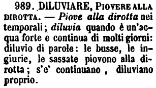 | Diluviare, Piovere alla dirotta - Piove alla dirotta nei temporali; diluvia quando è un'acqua forte e continua di molti giorni: diluvio di parole: le busse, le ingiurie, le sassate piovono alla dirotta; s'e' continuano, diluviano proprio. [immagine] |