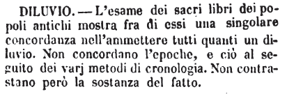 | Diluvio - L'esame dei sacri libri dei popoli antichi mostra fra di essi una singolare concordanza nell'ammettere tutti quanti un diluvio. Non concordano l'epoche, e ciò al seguito dei varj metodi di cronologia. Non contrastano però la sostanza del fatto. [immagine] |