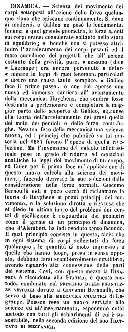 | Dinamica - Scienza del movimento dei corpi sottoposti all'azione delle forze qualunque siano che agiscano continuamente. Si deve ai moderni, e Galileo ne posò le fondamenta. Innanzi a quel grande geometra, le forze agenti sui corpi eransi considerate soltanto nello stato di equilibrio; e benchè non si potesse attribuire l'acceleramento dei corpi pesanti ed il moto curvilineo dei projettili che all'azione costante della gravità, pure, « nessuno (dice Lagrange) era ancora pervenuto a determinare le leggi di quei fenomeni particolari dietro una causa tanto semplice. » Galileo fece il primo passo, e con ciò aperse una nuova ed immensa carriera all'avanzamento della meccanica. Huyghens, che sembra fosse destinato a perfezionare e completare la maggior parte delle scoperte di Galileo, aggiunse alla teoria dell'acceleramento dei gravi quella del moto dei pendoli e delle forze centrifughe. Newton fece della meccanica una scienza nuova, ed i principj che pubblicò su tal materia nel 1687 furono l'epoca di quella rivoluzione. Ma l'invenzione del calcolo infinitesimale pose in grado di ridurre ad equazioni analitiche le leggi del movimento di un corpo, ed Euler per il primo fece un'applicazione di questo nuovo calcolo alla scienza dei movimenti, facendo derivare le sue soluzioni dalla considerazione delle forze normali. Giacomo Bernouilli indi a poco cercò di richiamare la teoria di Huyghens ai primi principj del movimento, e la soluzione diretta e rigorosa che ei diede in ultimo luogo dei problemi dei centri di oscillazione è risguardata dai geometri come il germe di un principio di dinamica, che d'Alembert ha indi renduto tanto fecondo. Il qual principio consiste in questo, cioè: che in ogni sistema di corpi sollecitati da forza qualunque, le quantità di moto impresse, e quelle che hanno luogo, prese in senso opposto, debbono farsi scambievolmente equilibrio, avendo riguardo alla connessione delle parti del sistema. Così, con questo mezzo la Dinamica è ricondotta alla Statica, è questo mtodo, combinato col principio delle prontezze virtuali dovute a Giovanni Bernouilli, che serve di base alla meccanica analitica di Lagrange. Poisson rese un nuovo sevigio alle scienze ed all'insegnamento, esponendo cotal metodo con tutti gli schiarimenti di cui è suscettibile, nella seconda edizione del suo Trattato di meccanica. [immagine] |