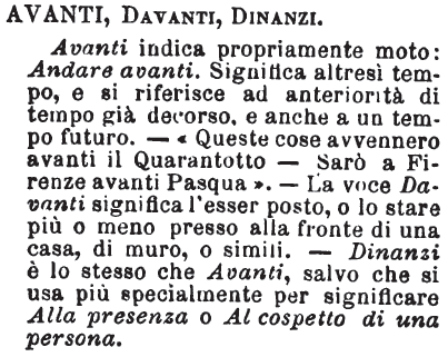 | Avanti, Davanti, Dinanzi - Avanti indica propriamente moto: Andare avanti. Significa altresì tempo, e si riferisce ad anteriorità di tempo già decorso, e anche a un tempo futuro. - « Queste cose avvennero avanti il Quarantotto - Sarò a Firenze avanti Pasqua ». - La voce Davanti significa l'esser posto, o lo stare più o meno presso alla fronte di una casa, di muro, o simili. - Dinanzi è lo stesso che Avanti, salvo che si usa più specialmente per significare Alla presenza o Al cospetto di una persona. [immagine] |
