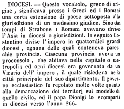 | Diocesi - Questo vocabolo, greco di origine, significava presso i Greci ed i Romani una certa estensione di paese sottoposta alla giurisdlzione di un medesimo giudice. Sino dai tempi di Strabone i Romani avevano diviso l'Asia in diocesi o giurisdizioni. In seguito Costantino divise l'impero in quattordici grandi diocesi, ognuna delle quali conteneva parecchie provincie. Ciascuna provincia aveva un proconsolo, che abitava nella capitale o metropoli; ed ogni diocesi era governata da un Vicario dell'impero, il quale risiedeva nella città principale del suo dipartimento. Il governo ecclesiastico fu regolato molte volte quanto alla demarcazione dei territorj sul modello di quello civile, ed il papa Dionigi lo scompartì in diocesi verso l'anno 266. [immagine] |