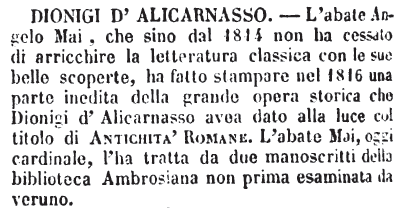 | Dionigi d’Alicarnasso - L'abate Angelo Mai, che sino dal 1814 non ha cessato di arricchire la letteratura classica con le sue belle scoperte, ha fatto stampare nel 1816 una parte inedita della grande opera storica che Dionigi d'Alicarnasso avea dato alla luce col titolo di Antichità Romane. L'abate Mai, oggi cardinale, l'ha tratta da due manoscritti della biblioteca Ambrosiana non prima esaminata da veruno. [immagine] |