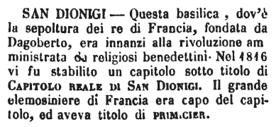 | San dionigi - Questa basilica, dov'è la sepoltura dei re di Francia, fondata da Dagoberto, era innanzi alla rivoluzione amministrata da religiosi benedettini. Nel 1816 vi fu stabilito un capitolo sotto titolo di Capitolo reale di San Dionigi. Il grande elemosiniere di Francia era capo del capitolo, ed aveva titolo di primicier. [immagine] |