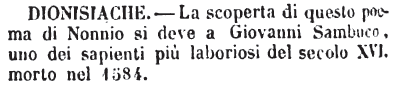 | Dionisiache - La scoperta di questo poema di Nonnio si deve a Giovanni Sambuco, uno dei sapienti più laboriosi del secolo XVI. morto nel 1584. [immagine] |