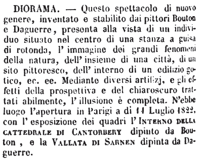 | Diorama - Questo spettacolo di nuovo genere, inventato e stabilito dai pittori Bouton e Daguerre, presenta alla vista di un individuo situato nel centro di una stanza a guisa di rotonda, l'immagine dei grandi fenomeni della natura, dell'insieme di una città, di un sito pittoresco, dell'interno di un edifizio gotico, ec. ec. Mediante diversi artifizj, e gli effetti della prospettiva e del chiaroscuro trattati abilmente, l'illusione è completa. N'ebbe luogo l'apertura in Parigi a dì 11 Luglio 1822, con l'esposizione dei quadri l'Interno della cattedrale di Cantorbery dipinto da Bouton, e la Vallata di Sarnen dipinta da Daguerre. [immagine] |