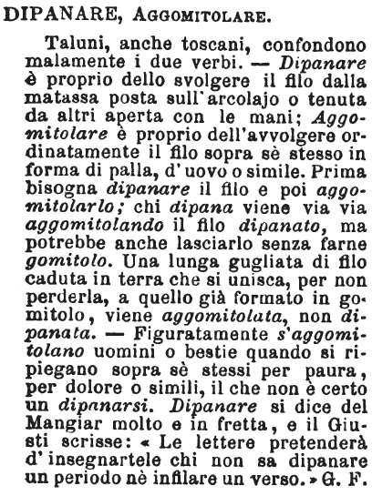 | Dipanare, Aggomitolare - Taluni, anche toscani, confondono malamente i due verbi. - Dipanare è proprio dello svolgere il filo dalla matassa posta sull'arcolajo o tenuta da altri aperta con le mani; Aggomitolare è proprio dell'avvolgere ordinatamente il filo sopra sè stesso in forma di palla, d'uovo o simile. Prima bisogna dipanare il filo e poi aggomitolarlo; chi dipana viene via via aggomitolando il filo dipanato, ma potrebbe anche lasciarlo senza farne gomitolo. Una lunga gugliata di filo caduta in terra che si unisca, per non perderla, a quello già formato in gomitolo, viene aggomitolata, non dipanata. - Figuratamente s'aggomitolano uomini o bestie quando si ripiegano sopra sè stessi per paura, per dolore o simili, il che non è certo un dipanarsi. Dipanare si dice del Mangiar molto e in fretta, e il Giusti scrisse: « Le lettere pretenderà d'insegnartele chi non sa dipanare un periodo nè infilare un verso. » G. F. [immagine] |