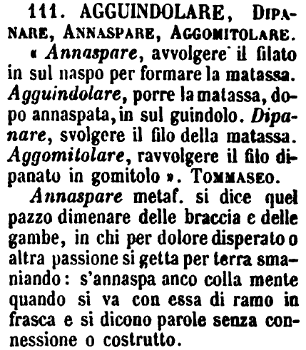 | Agguindolare, Dipanare, Annaspare, Aggomitolare - « Annaspare, avvolgere il filato in sul naspo per formare la matassa. Agguindolare, porre la matassa, dopo annaspata, in sul guindolo. Dipanare, svolgere il filo della matassa. Aggomitolare, ravvolgere il filo dipanato in gomitolo ». Tommaseo.