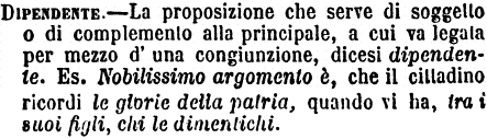| Dipendente - La proposizione che serve di soggetto o di complemento alla principale, a cui va legata per mezzo d'una congiunzione, dicesi dipendente. Es. Nobilissimo argomento è, che il cittadino ricordi le glorie della patria, quando vi ha, tra i suoi figli, chi le dimentichi. [immagine] |