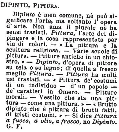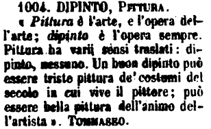 | Dipinto, Pittura - «Pittura è l'arte, e l'opera dell'arte; dipinto è l'opera sempre. Pittura ha varii sensi traslati: dipinto, nessuno. Un buon dipinto può essere triste pittura de' costumi del secolo in cui vive il pittore: può essere bella pittura dell'animo dell'artista». Tommaseo. [immagine] |