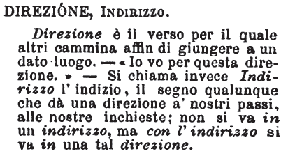 | Direzione, Indirizzo - Direzione è il verso per il quale altri cammina affin di giungere a un dato luogo. - «Io vo per questa direzione.» - Si chiama invece Indirizzo l'indizio, il segno qualunque che dà una direzione a' nostri passi, alle nostre inchieste; non si va in un indirizzo, ma con l'indirizzo si va in una tal direzione. [immagine] |