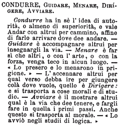 | Condurre, Guidare, Menare, Dirigere, Avviare - Condurre ha in sè l'idea di autorità, o almeno di superiorità, e vale Andar con altrui per cammino, affine di farlo arrivare dove dee andare. - Guidare è accompagnare altrui per insegnarli la via. - Menare è far si che altri, o con l'arte, o con la forza, venga teco in alcun luogo. - «Lo presero e lo menarono in prigione.» - L'accennare altrui per qual verso debba ire per giungere colà dove vuole, quello è Dirigere: e si trasporta a cose morali e di studio. - Avviare è il mostrare altrui quel è la via che dee tenere, e fargli fare in quella i primi passi. Anche questo si trasporta al morale. - «Lo avviò negli studi di logica.» [immagine] |