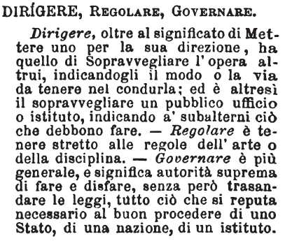 | Dirigere, Regolare, Governare - Dirigere, oltre al significato di Mettere uno per la sua direzione, ha quello di Sopravvegliare l'opera altrui, indicandogli il modo o la via da tenere nel condurla; ed è altresì il sopravvegliare un pubblico ufficio o istituto, indicando a' subalterni ciò che debbono fare. - Regolare è tenere stretto alle regole dell'arte o della disciplina. - Governare è più generale, e significa autorità suprema di fare e disfare, senza però trasandare le leggi, tutto ciò che si reputa necessario al buon procedere di uno Stato, di una nazione, di un istituto. [immagine] |