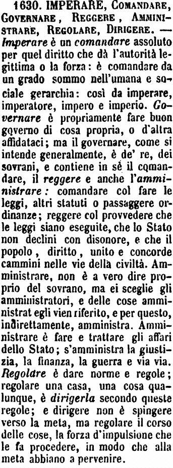 | Imperare, Comandare, Governare, Reggere, Amministrare, Regolare, Dirigere - Imperare è un comandare assoluto per quel diritto che dà l'autorità legittima o la forza: è comandare da un grado sommo nell'umana e sociale gerarchia: così da imperare, imperatore, impero e imperio. Governare è propriamente fare buon governo di cosa propria, o d'altra affidataci; ma il governare, come si intende generalmente, è de' re, dei sovrani, e contiene in sè il comandare, il reggere e anche l'amministrare: comandare col fare le leggi, altri statuti o passaggere ordinanze; reggere col provvedere che le leggi siano eseguite, che lo Stato non declini con disonore, e che il popolo, diritto, unito e concorde cammini nelle vie della civiltà. Amministrare, non è a vero dire proprio del sovrano, ma ei sceglie gli amministratori, e delle cose amministrat egli vien riferito, e per questo, indirettamente, amministra. Amministrare è fare e trattare gli affari dello Stato; s'amministra la giustizia, la finanza, la guerra e via via. Regolare è dare norme e regole; regolare una casa, una cosa qualunque, è dirigerla secondo queste regole; e dirigere non è spingere verso la meta, ma regolare il corso delle cose, la forza d'impulsione che le fa procedere, in modo che alla meta abbiano a pervenire. [immagine] |