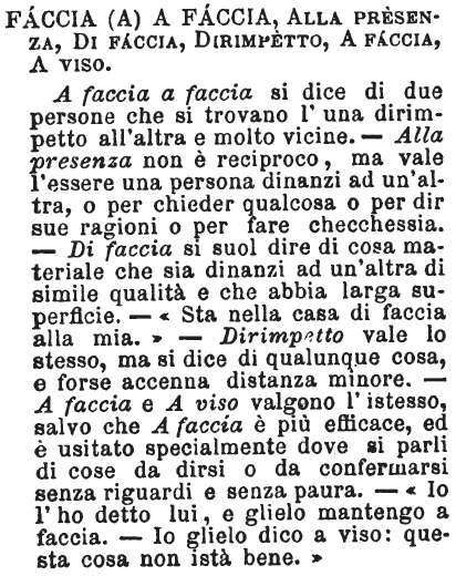 | Faccia (a) a faccia, Alla presenza, Di faccia, Dirimpetto, A faccia, A viso - A faccia a faccia si dice di due persone che si trovano l'una dirimpetto all'altra e molto vicine. - Alla presenza non è reciproco, ma vale l'essere una persona dinanzi ad un'altra, o per chieder qualcosa o per dir sue ragioni o per fare checchessia. - Di faccia si suol dire di cosa materiale che sia dinanzi ad un'altra di simile qualità e che abbia larga superficie. - «Sta nella casa di faccia alla mia.» - Dirimpetto vale lo stesso, ma si dice di qualunque cosa, e forse accenna distanza minore. - A faccia e A viso valgono l'istesso, salvo che A faccia è più efficace, ed è usitato specialmente dove si parli di cose da dirsi o da confermarsi senza riguardi e senza paura. - «Io l'ho detto lui, e glielo mantengo a faccia. - Io glielo dico a viso: questa cosa non istà bene.» [immagine] |