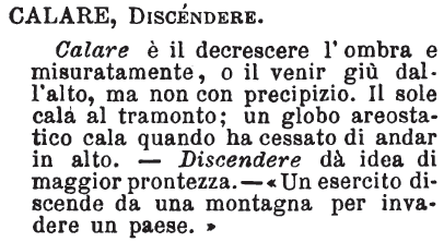 | Calare, Discendere - Calare è decrescere l'ombra e misuratamente, o il venir giù dall'alto, ma non con precipizio. Il sole cala al tramonto; un globo areostatico cala quando ha cessato di andar in alto. - Discendere dà l'idea di maggior prontezza. - «Un esercito discende da una montagna per invadere un paese.» [immagine] |
