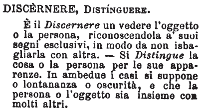 | Discernere, Distinguere - E' il Discernere un vedere l'oggetto o la persona, riconoscendola a' suoi segni esclusivi, in modo da non isbagliarla con altra. - Si Distingue la cosa o la persona per le sue apparenze. In ambedue i casi si suppone o lontananza o oscurità, e che la persona o l'oggetto sia insieme con molti altri. [immagine] |