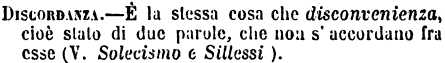| Discordanza - E' la stessa cosa che disconvenienza, cioè stato di due parole, che non s'accordano fra esse (V. Solecismo e Sillessi). [immagine] |