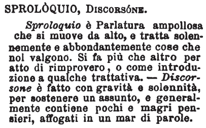 | Sproloquio, Discorsone - Sproloquio è Parlatura ampollosa che si muove da alto, e tratta solennemente e abbondantemente cose che nol valgono. Si fa più che altro per atto di rimprovero, o come introduzione a qualche trattativa. - Discorsone è fatto con gravità e solennità, per sostenere un assunto, e generalmente contiene pochi e magri pensieri, affogati in un mar di parole. [immagine] |