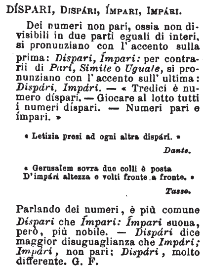 | Dispari, Impari - Dei numeri non pari, ossia non divisibili in due parti eguali di interi, si pronunziano con l'accento sulla prima: Díspari, Ímpari: per contrarii di Pari, Simile o Uguale, si pronunziano con l'accento sull'ultima: Dispári, Impári. - «Tredici è numero díspari - Giocare al lotto tutti i numeri díspari. - Numeri pari e ímpari.»