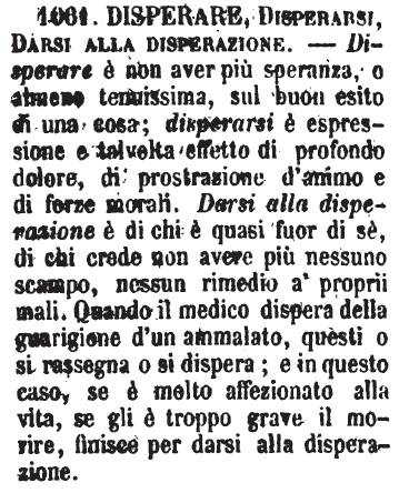 | Disperare, Disperarsi, Darsi alla disperazione - Disperare è non aver più speranza, o almeno tenuissima, sul buon esito di una cosa; disperarsi è espressione e talvolta effetto di profondo dolore, di prostrazione d'animo e di forze morali. Darsi alla disperazione è di chi è quasi fuor di sè, di chi crede non avere più nessuno scampo, nessun rimedio a' proprii mali. Quando il medico dispera della guarigione d'un ammalato, questi o si rassegna o si dispera; e in questo caso, se è molto affezionato alla vita, se gli è troppo grave il morire, finisce per darsi alla disperazione. [immagine] |