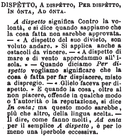 | Dispetto, A dispetto, Per dispetto, In onta, Ad onta - A dispetto significa Contro la volontà, e si dice quando sappiamo che la cosa fatta non sarebbe approvata. - «A dispetto del suo divieto, son voluto andare.» Si applica anche a ostacoli da vincere. - «A dispetto di mare e di vento approdammo all'isola.» - Quando diciamo Per dispetto vogliamo significare che la cosa è fatta per far dispiacere, misto a dispregio. - «Glielo faceva per dispetto.» E quando la cosa, oltre al non piacere, offende in qualche modo o l'autorità o la reputazione, si dice In onta; ma questo modo sarebbe, più che altro, della lingua scelta. - Il dire, come fanno molti, Ad onta per il semplice A dispetto, è per lo meno una iperbole eccessiva. [immagine] |