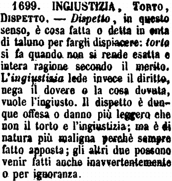 | Ingiustizia, Torto, Dispetto - Dispetto, in questo senso, è cosa fatta o detta in onta di taluno per fargli dispiacere: torto si fa quando non si rende esatta o intera ragione secondo il merito. L'ingiustizia lede invece il diritto, nega il dovere o la cosa dovuta, vuole l'ingiusto. Il dispetto è dunque offesa o danno più leggero che non il torto e l'ingiustizia; ma è di natura più maligna perché sempre fatto apposta; gli altri due possono venir fatti anche inavvertentemente o per ignoranza. [immagine] |