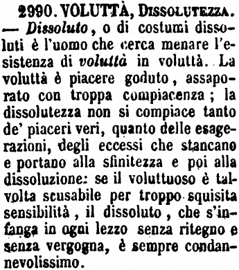 | Voluttà, Dissolutezza - Dissoluto, o di costumi dissoluti è l'uomo che cerca menare l'esistenza di voluttà in voluttà. La voluttà è piacere goduto, assaporato con troppa compiacenza; la dissolutezza non si compiace tanto de' piaceri veri, quanto delle esagerazioni, degli eccessi che stancano e portano alla sfinitezza e poi alla dissoluzione: se il voluttuoso è talvolta scusabile per troppo squisita sensibilità, il dissoluto, che s'infanga in ogni lezzo senza ritegno e senza vergogna, è sempre condannevolissimo. [immagine] |