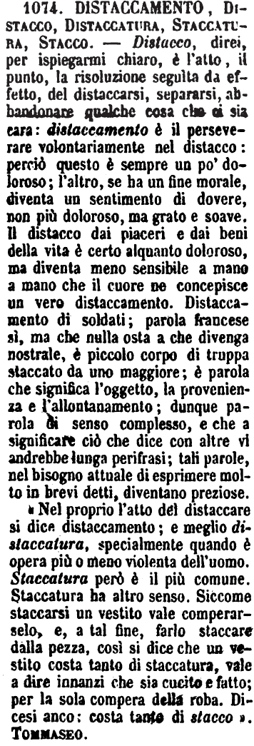 | Distaccamento, Distacco, Distaccatura, Staccatura, Stacco - Distacco, direi, per ispiegarmi chiaro, è l'atto, il punto, la risoluzione seguìta da effetto, del distaccarsi, separarsi, abbandonare qualche cosa che ci sia cara: distaccamento è il perseverare volontariamente nel distacco: perciò questo è sempre un po' doloroso; l'altro, se ha un fine morale, diventa un sentimento di dovere, non più doloroso, ma grato e soave. Il distacco dai piaceri e dai beni della vita è certo alquanto doloroso, ma diventa meno sensibile a mano a mano che il cuore ne concepisce un vero distaccamento. Distaccamento di soldati; parola francese sì, ma che nulla osta a che divenga nostrale, è piccolo corpo di truppa staccato da uno maggiore; è parola che significa l'oggetto, la provenienza e l'allontanamento; dunque parola di senso complesso, e che a significare ciò che dice con altre vi andrebbe lunga perifrasi; tali parole, nel bisogno attuale di esprimere molto in brevi detti, diventano preziose.