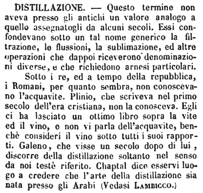 Sotto i re, ed a tempo della repubblica, i Romani, per quanto sembra, non conoscevano l'acquavite. Plinio, che scriveva nel primo secolo dell'era cristiana, non la conosceva. Egli ci ha lasciato un ottimo libro sopra la vite ed il vino, e non vi parla dell'acquavite, benchè consideri il vino sotto tutti i suoi rapporti. Galeno, che visse un secolo dopo di lui, discorre della distillazione soltanto nel senso da noi testè riferito. Chaptal dice esservi luogo a credere che l'arte della distilllazione sia nata presso gli Arabi. (Vedasi Lambicco.) [immagine] |