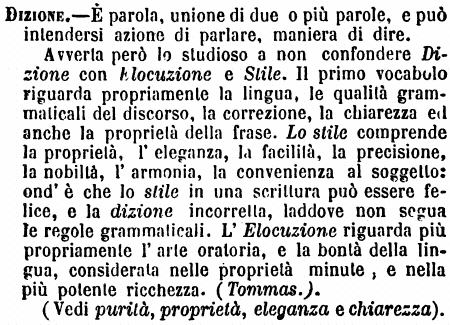 Avverta però lo studioso a non confondere Dizione con Elocuzione e Stile. Il primo vocabolo riguarda propriamente la lingua, le qualità grammaticali del discorso, la correzione, la chiarezza ed anche la proprietà della frase. Lo stile comprende la proprietà, l'eleganza, la facilità, la precisione, la nobiltà, l'armonia, la convenienza al soggetto: ond'è che lo stile in una scrittura può essere felice, e la dizione incorretta, laddove non segua le regole grammaticali. L'Elocuzione riguarda più propriamente l'arte oratoria, e la bontà della lingua, considerata nelle proprietà minute, e nella più potente ricchezza. (Tommas.).