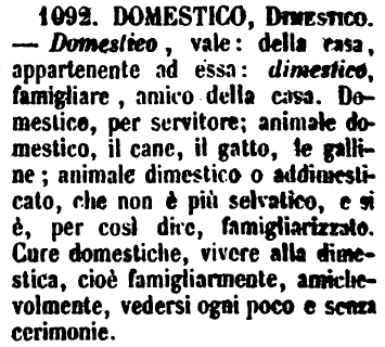 | Domestico, Dimestico - Domestico, vale: della casa, appartenente ad essa: dimestico, famigliare, amico della casa. Domestico, per servitore; animale domestico, il cane, il gatto, le galline; animale dimestico o addimesticato, che non è più selvatico, e si è, per così dire, famigliarizzato. Cure domestiche, vivere alla dimestica, cioè famigliarmente, amichevolmente, vedersi ogni poco e senza cerimonie. [immagine] |
