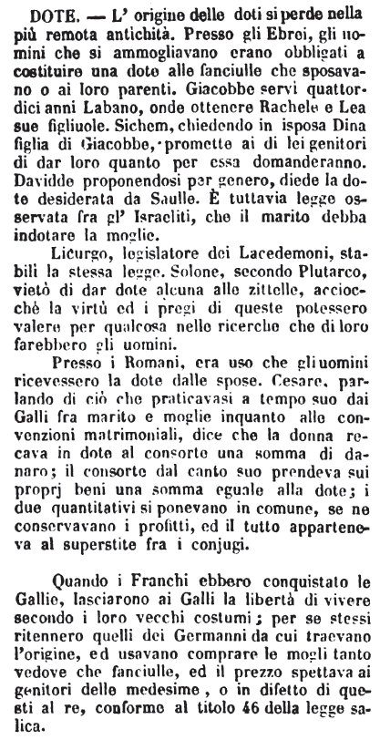 | Dote - L'origine delle doti si perde nella più remota antichità. Presso gli Ebrei, gli uomini che si ammogliavano erano obbligati a costituire una dote alle fanciulle che sposavano o ai loro parenti. Giacobbe servì quattordici anni Labano, onde ottenere Rachele e Lea sue figliuole. Sichem, chiedendo in isposa Dina figlia di Giacobbe, promette ai di lei genitori di dar loro quanto per essa domanderanno. Davidde proponendosi per genero, diede la dote desiderata da Saulle. E' tuttavia legge osservata fra gl'Israeliti, che il marito debba indotare la moglie.
