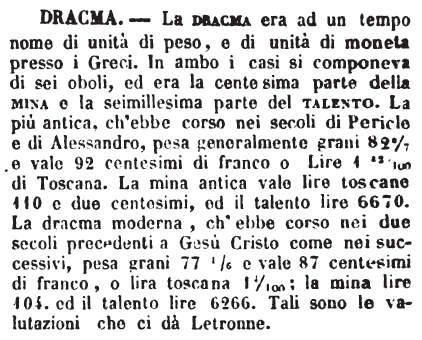 | Dracma - La dracma era ad un tempo nome di unità di peso, e di unità di moneta presso i Greci. In ambo i casi si componeva di sei oboli, ed era la centesima parte della mina e la seimillesima parte del talento. La più antica, ch'ebbe corso nei secoli di Pericle e di Alessandro, pesa generalmente grani 82 2/7 e vale 92 centesimi di franco o Lire 1 12/100 di Toscana. La mina antica vale lire toscane 110 e due centesimi, ed il talento lire 6670. La dracma moderna, ch'ebbe corso nei due secoli precedenti a Gesù Cristo come nei successivi, pesa grani 77 1/6 e vale 87 centesimi di franco, o lira toscana 1 4/100; la mina lire 104, ed il talento lire 6266. Tali sono le valutazioni che ci dà Letronne. [immagine] |